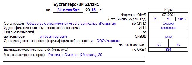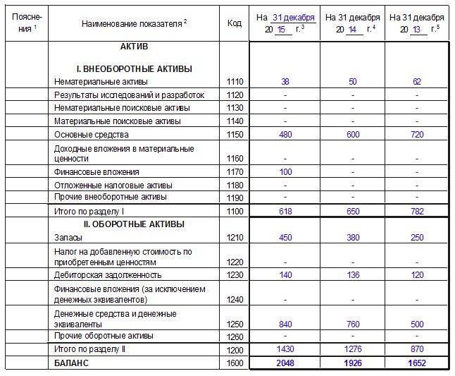 Форма баланса имеет титульную часть, раздел с активами и раздел с пассивами. Разделы поделены на три графы – в первую графу вносятся данные по состоянию на 31 декабря 2015 года, во вторую – на 31.12.2014, в третью – на 31.12.2013.