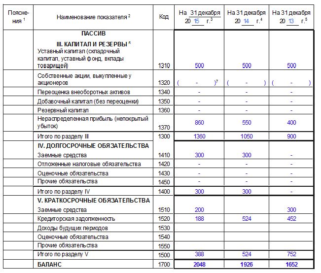 Образец заполнения раздела баланса с пассивами можно посмотреть на скриншоте выше.