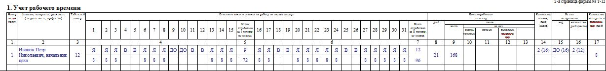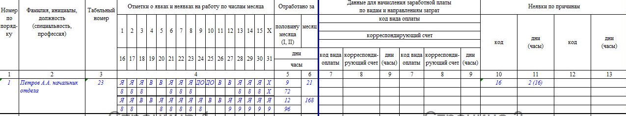 - с помощью кода “ДО”, либо числа “16” в табеле обозначается пребывание сотрудника в неоплачиваемом отпуске за свой счет по договоренности с работодателем, при этом отмечается количество часов, приходящихся на этот период.